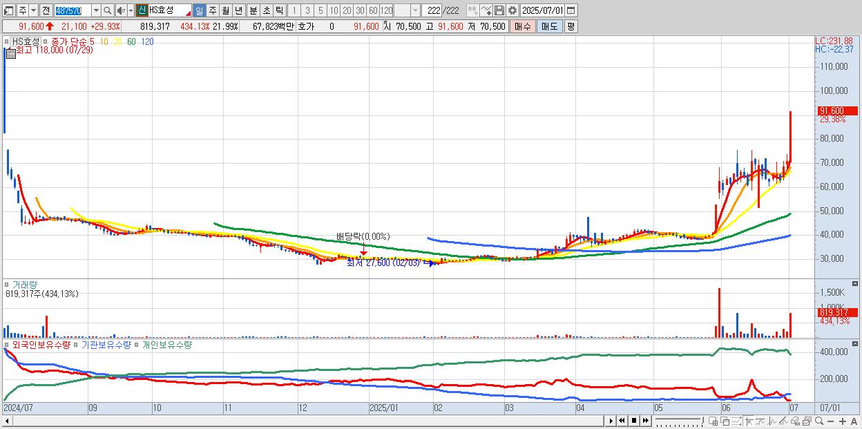 - HS효성 (91,600원 ▲ 29.93% , 시총: 3,413억, 거래량: 320,841, 거래대금:271억)