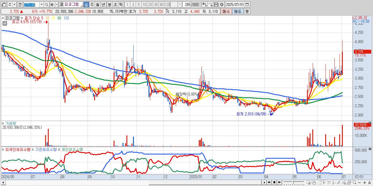 - 피코그램 (3,725원 ▲ 19.77% , 시총: 691억, 거래량: 20,593,386, 거래대금:762억)