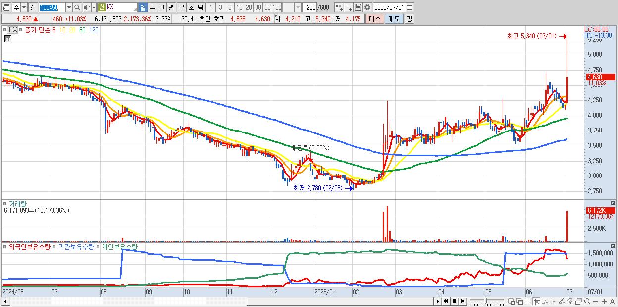 - KX (4,630원 ▲ 11.03% , 시총: 2,075억, 거래량: 6,171,893, 거래대금:304억)