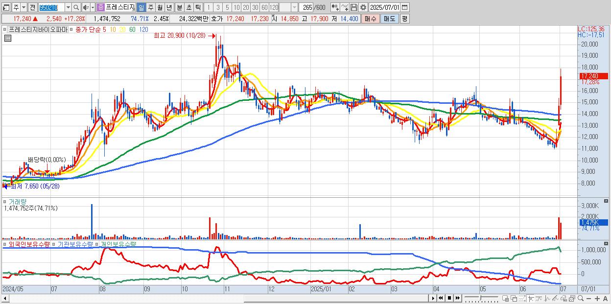 - 프레스티지바이오파마 (17,240원 ▲ 17.28% , 시총: 10,361억, 거래량: 1,474,752, 거래대금:243억)