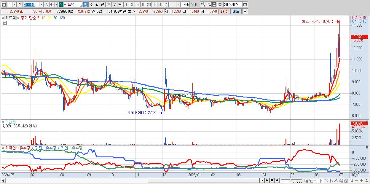 - 위드텍 (12,970원 ▲ 15.8% , 시총: 1,321억, 거래량: 7,909,182, 거래대금:1,050억)