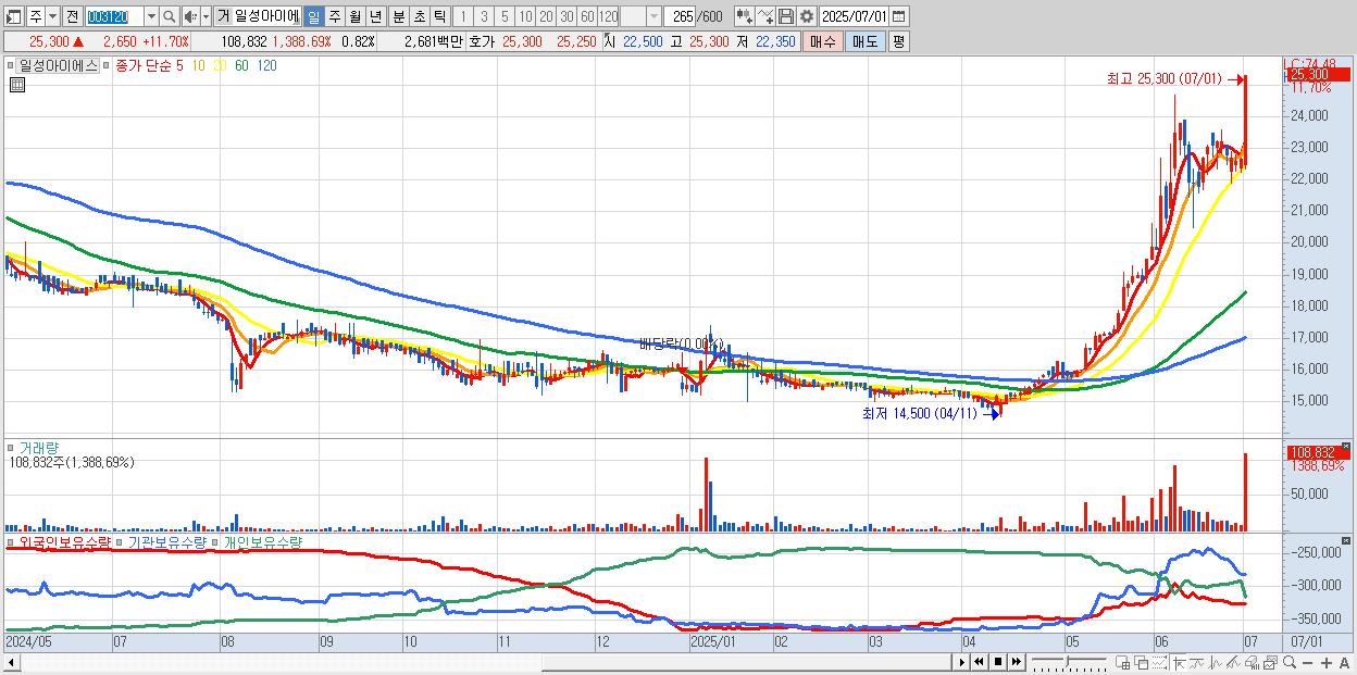 - 일성아이에스 (25,300원 ▲ 11.7% , 시총: 3,365억, 거래량: 108,832, 거래대금:27억)