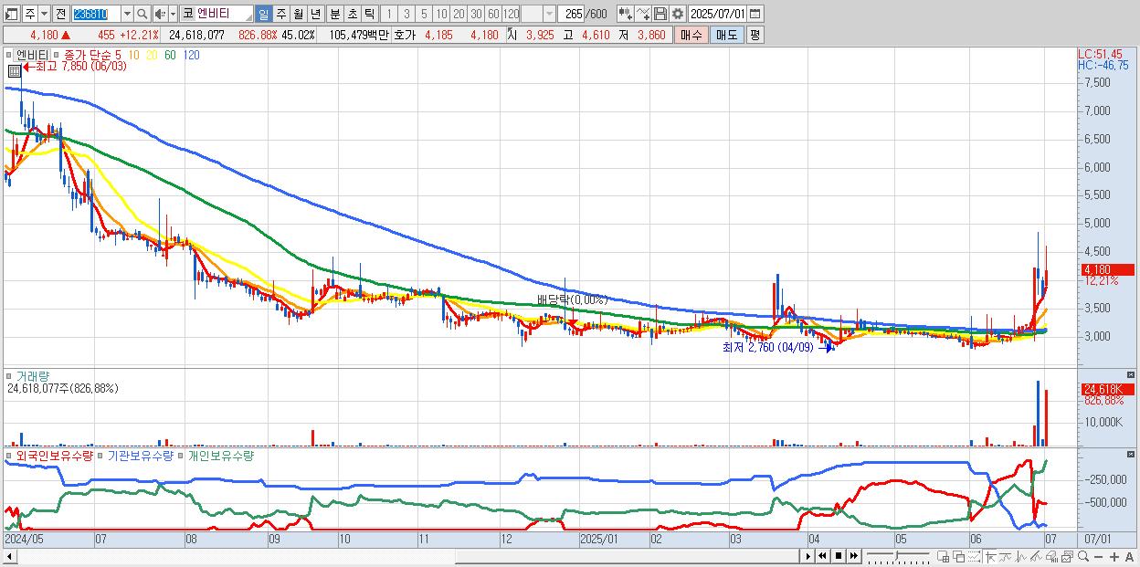- 엔비티 (4,180원 ▲ 12.21% , 시총: 710억, 거래량: 24,618,077, 거래대금:1,055억)