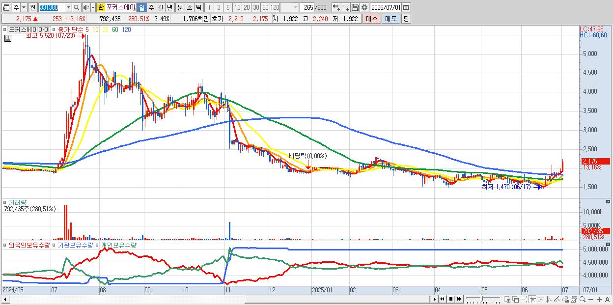- 포커스에이아이 (2,175원 ▲ 13.16% , 시총: 494억, 거래량: 792,435, 거래대금:17억)