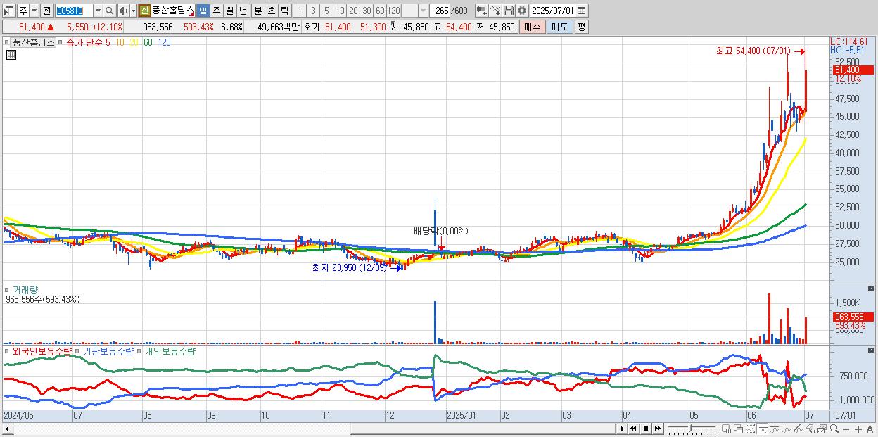 - 풍산홀딩스 (51,400원 ▲ 12.1% , 시총: 7,410억, 거래량: 654,487, 거래대금:338억)