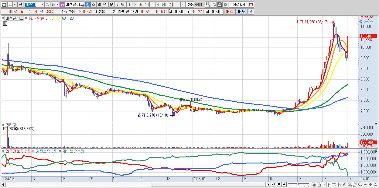 - 대성홀딩스 (10,540원 ▲ 10.83% , 시총: 1,696억, 거래량: 197,789, 거래대금:20억)