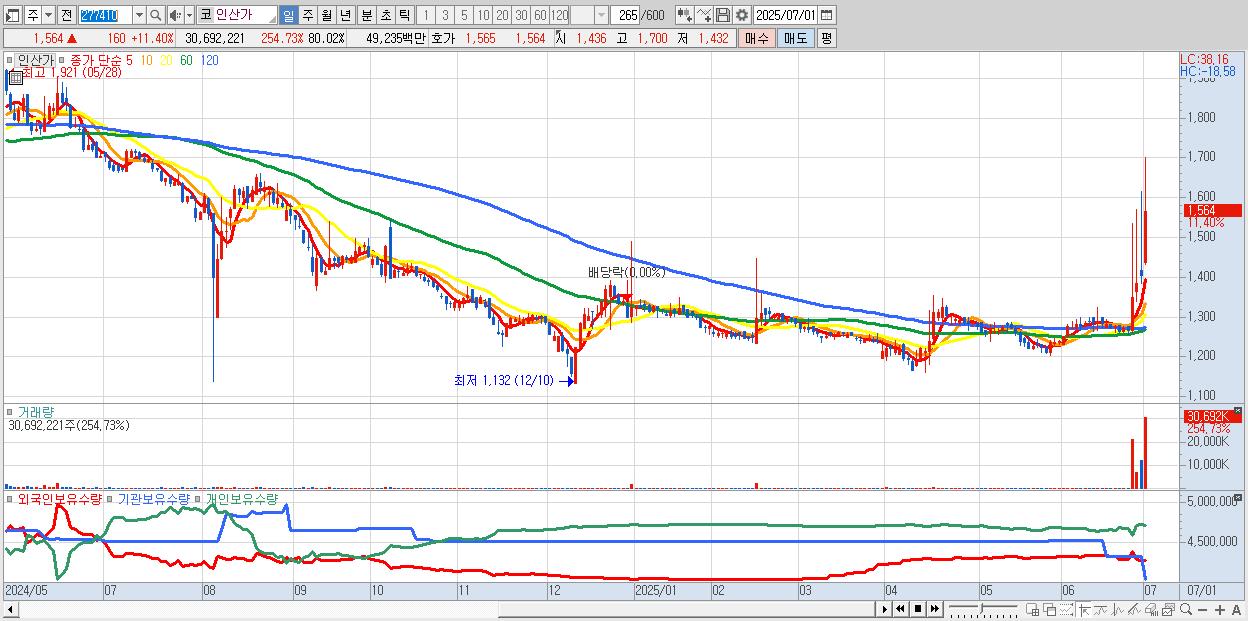 - 인산가 (1,564원 ▲ 11.4% , 시총: 600억, 거래량: 30,692,221, 거래대금:492억)