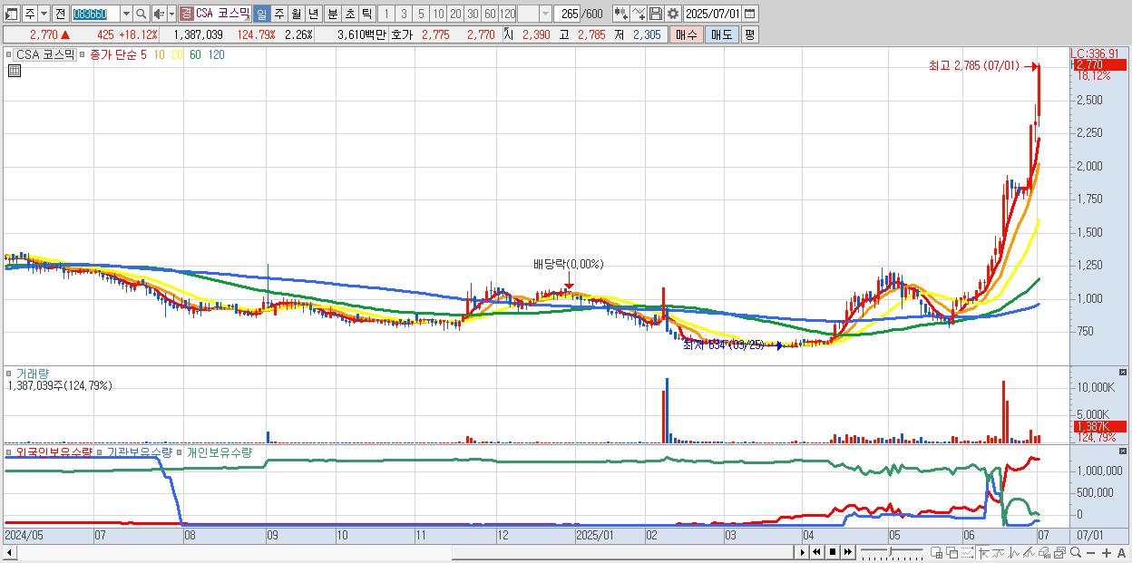 - CSA 코스믹 (2,770원 ▲ 18.12% , 시총: 1,697억, 거래량: 1,387,039, 거래대금:36억)