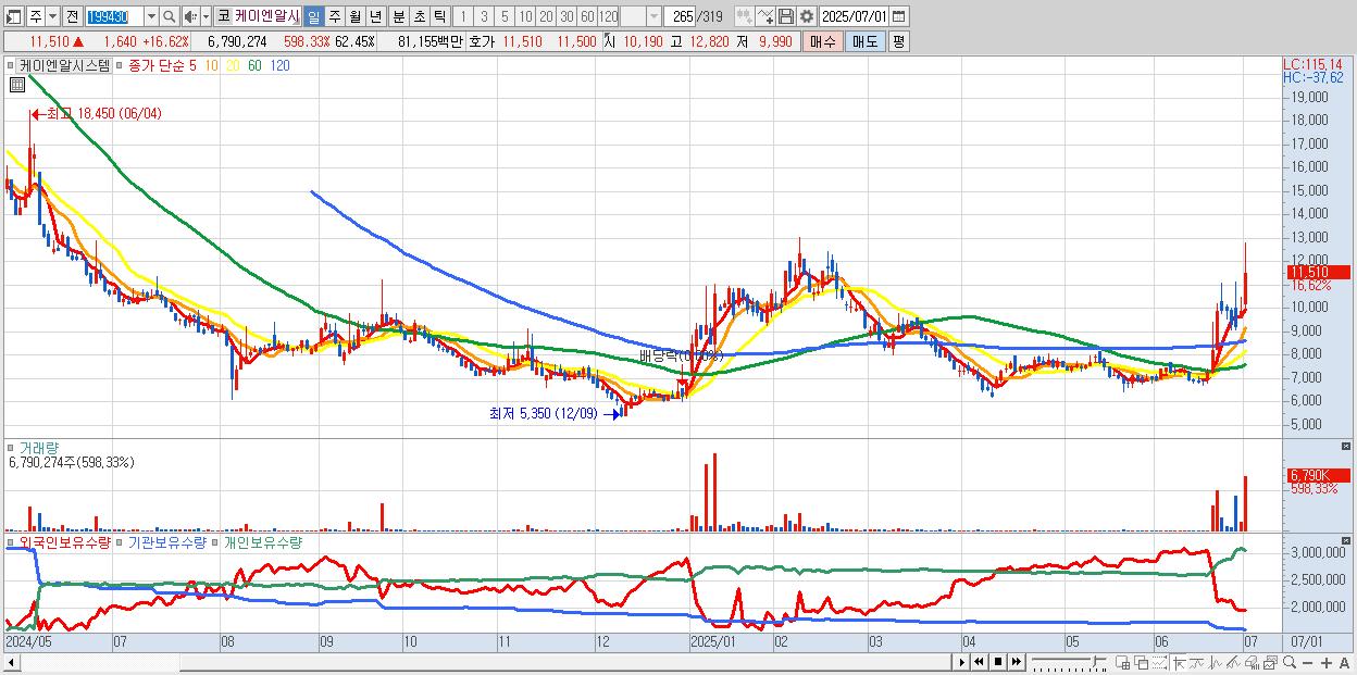 - 케이엔알시스템 (11,510원 ▲ 16.62% , 시총: 1,251억, 거래량: 6,790,274, 거래대금:812억)