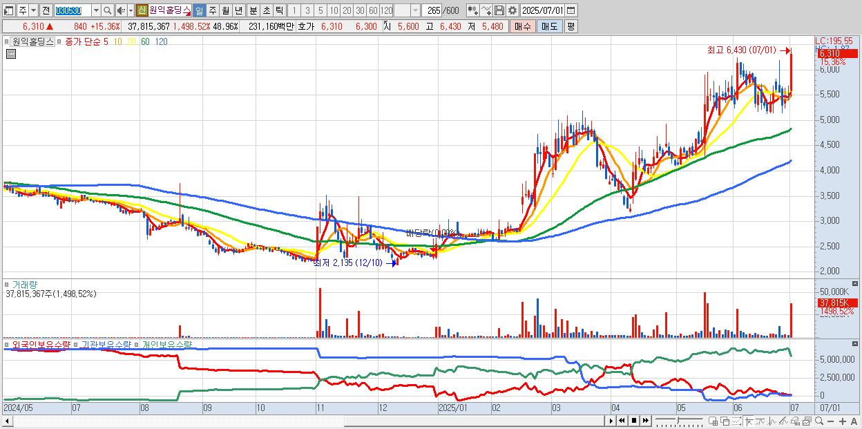 - 원익홀딩스 (6,140원 ▲ 12.25% , 시총: 4,742억, 거래량: 21,150,494, 거래대금:1,292억)