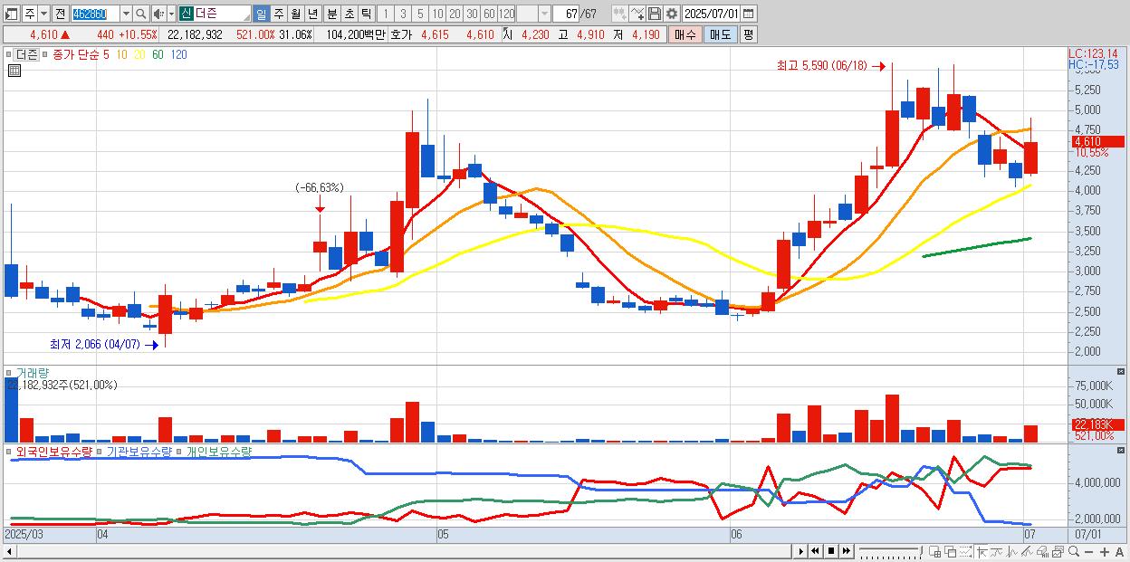 - 더즌 (4,610원 ▲ 10.55% , 시총: 3,292억, 거래량: 22,182,932, 거래대금:1,042억)
