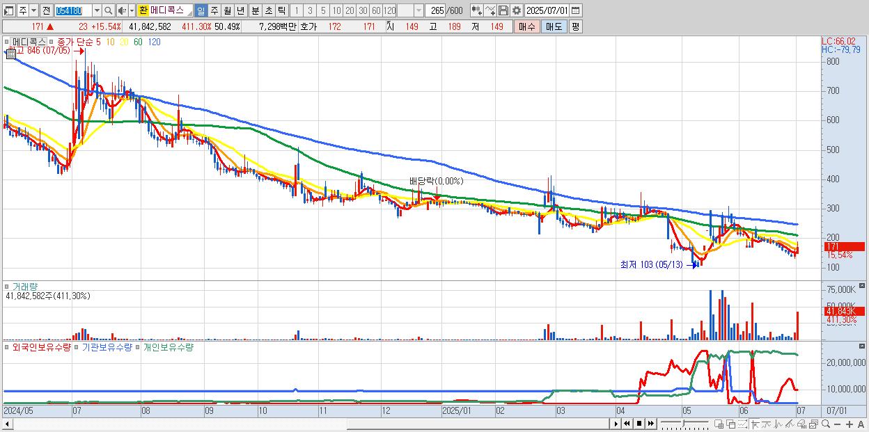 - 메디콕스 (171원 ▲ 15.54% , 시총: 142억, 거래량: 41,842,582, 거래대금:73억)