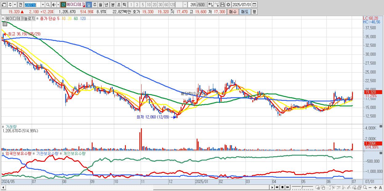 - 에이디테크놀로지 (19,080원 ▲ 10.8% , 시총: 2,565억, 거래량: 638,282, 거래대금:120억)