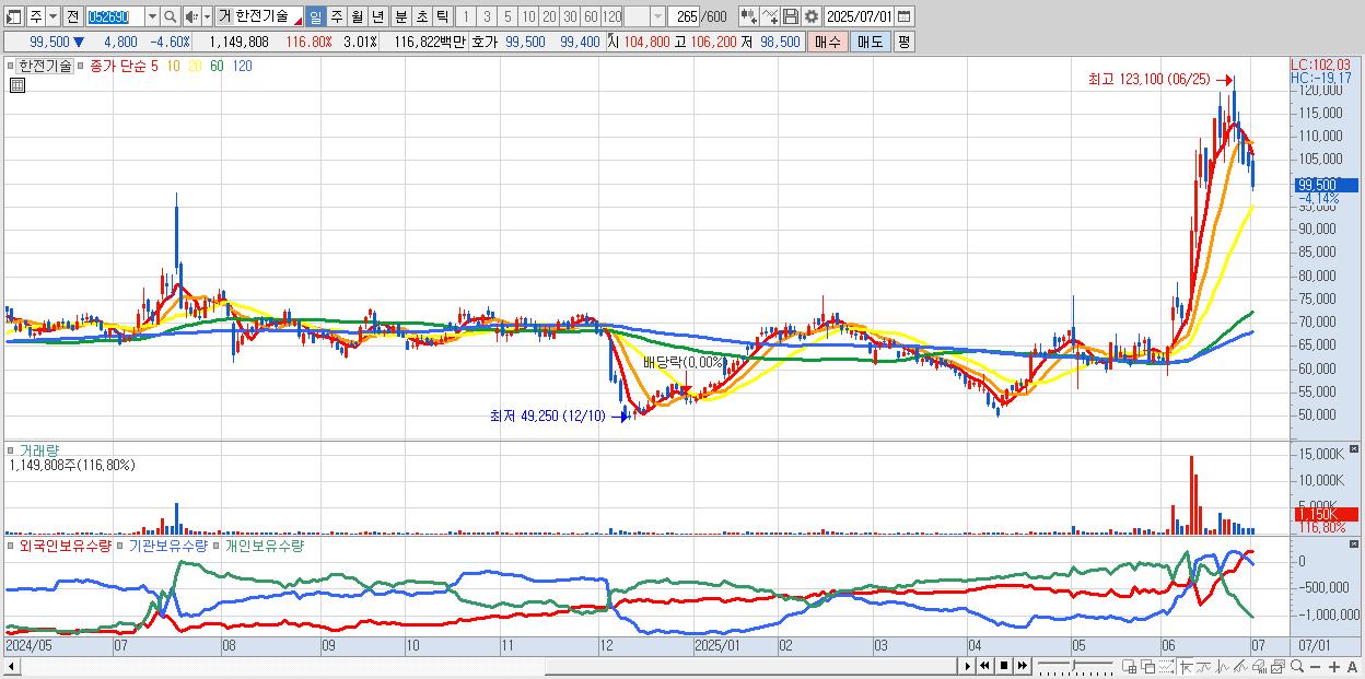 - 한전기술 (99,400원 ▼ -4.7% , 시총: 37,991억, 외국인 순매수 거래금:170억)