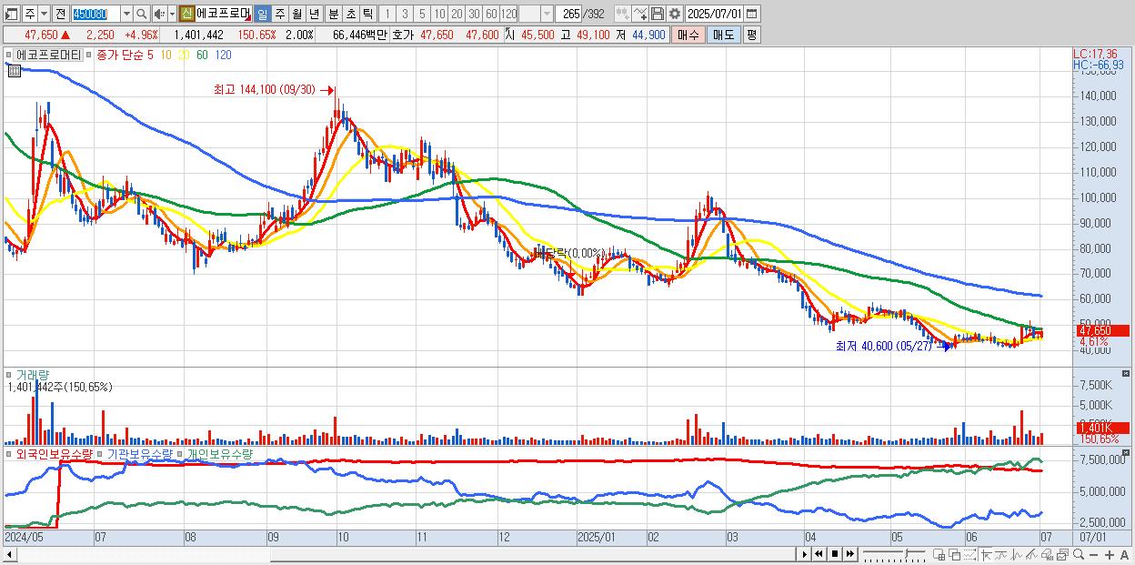 - 에코프로머티 (47,700원 ▲ 5.07% , 시총: 33,358억, 외국인 순매수 거래금:81억)