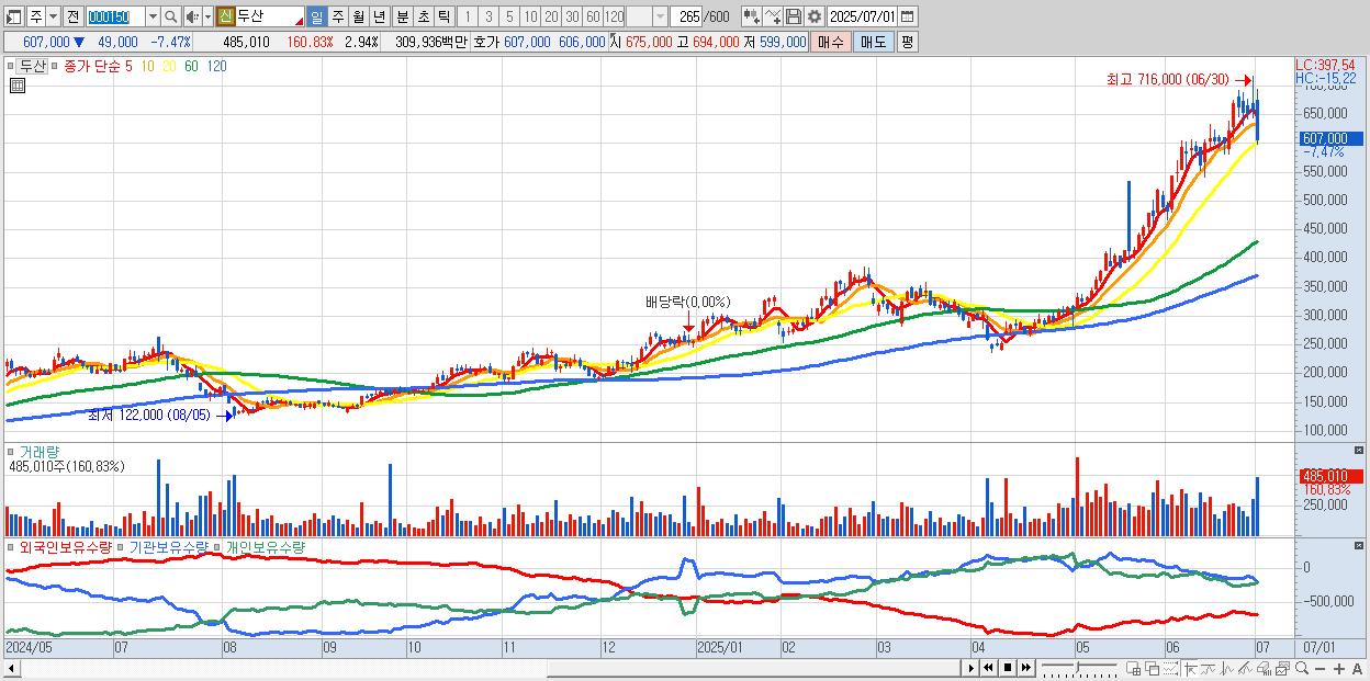- 두산 (605,000원 ▼ -7.77% , 시총: 99,969억, 외국인 순매수 거래금:169억)