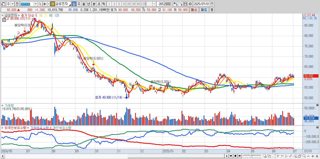 - 삼성전자 (60,200원 ▲ 0.67% , 시총: 3,563,622억, 외국인 순매수 거래금:86억)