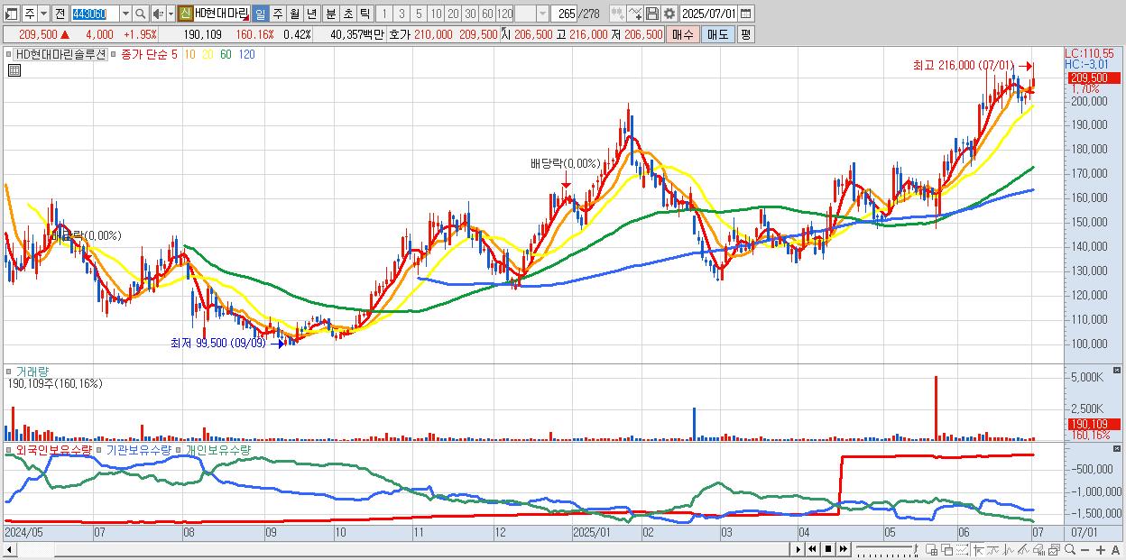 - HD현대마린솔루션 (208,500원 ▲ 1.46% , 시총: 93,469억, 외국인 순매수 거래금:72억)