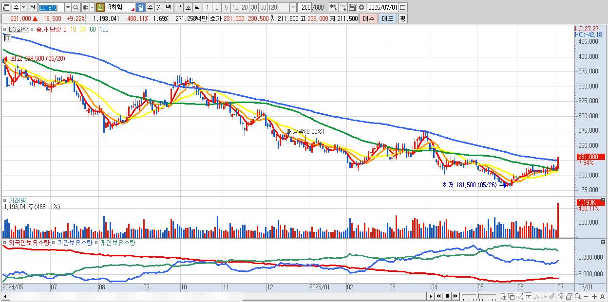 - LG화학 (229,000원 ▲ 8.27% , 시총: 161,656억, 외국인 순매수 거래금:369억)