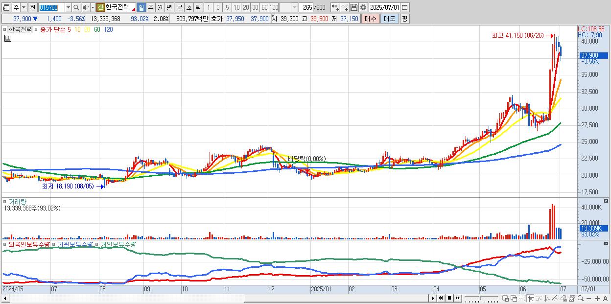 - 한국전력 (37,950원 ▼ -3.44% , 시총: 243,625억, 외국인 순매수 거래금:339억)