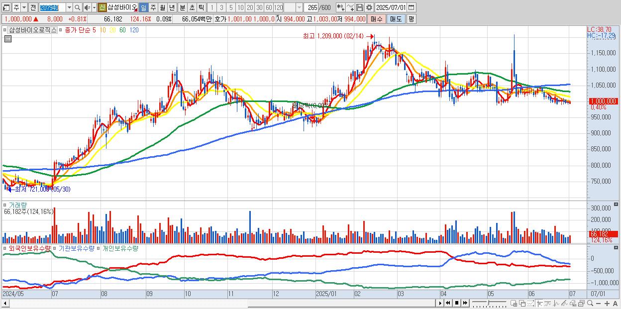 - 삼성바이오로직스 (1,003,000원 ▲ 1.11% , 시총: 713,875억, 외국인 순매수 거래금:95억)