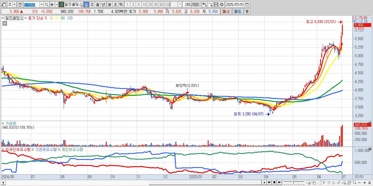 - 일진홀딩스 (5,900원 ▲ 5.55% , 시총: 2,912억, 거래량: 840,033, 거래대금:49억, KOSPI)