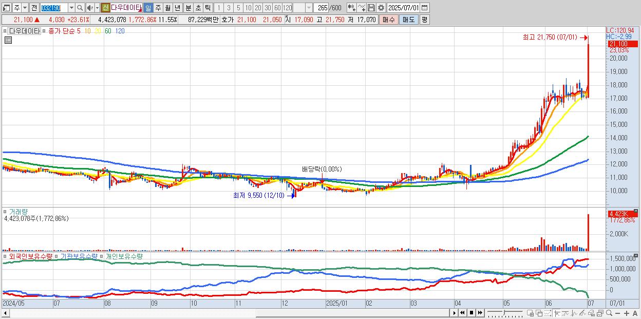 - 다우데이타 (19,810원 ▲ 16.05% , 시총: 7,587억, 거래량: 1,973,086, 거래대금:381억, KOSDAQ)