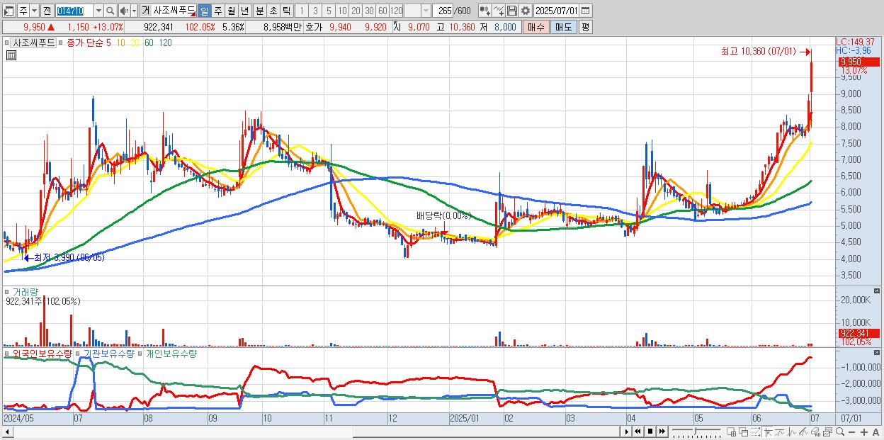 - 사조씨푸드 (10,000원 ▲ 13.64% , 시총: 1,722억, 거래량: 614,332, 거래대금:60억, KOSPI)