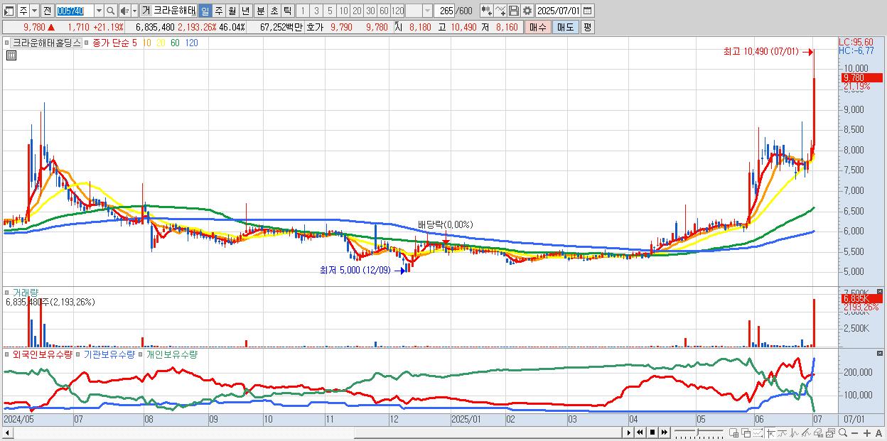 - 크라운해태홀딩스 (9,780원 ▲ 21.19% , 시총: 1,452억, 거래량: 6,835,480, 거래대금:673억, KOSPI)