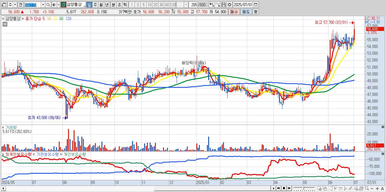 - 삼양통상 (56,600원 ▲ 3.1% , 시총: 1,698억, 거래량: 5,617, 거래대금:3억, KOSPI)