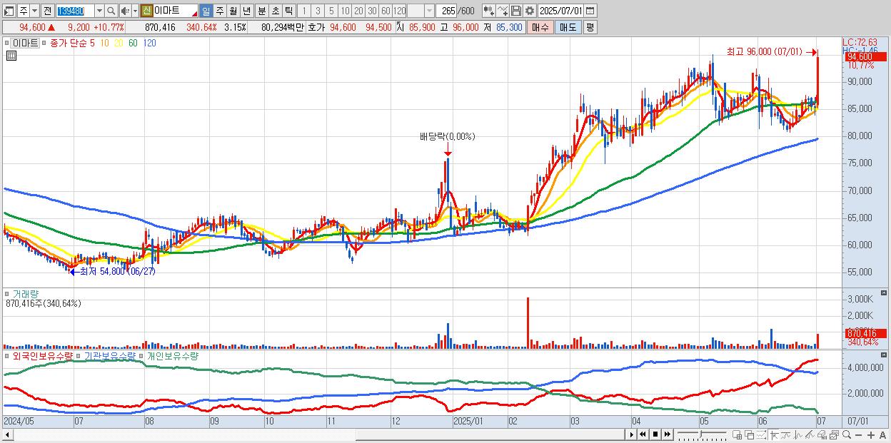 - 이마트 (95,100원 ▲ 11.36% , 시총: 26,244억, 거래량: 635,412, 거래대금:585억, KOSPI)