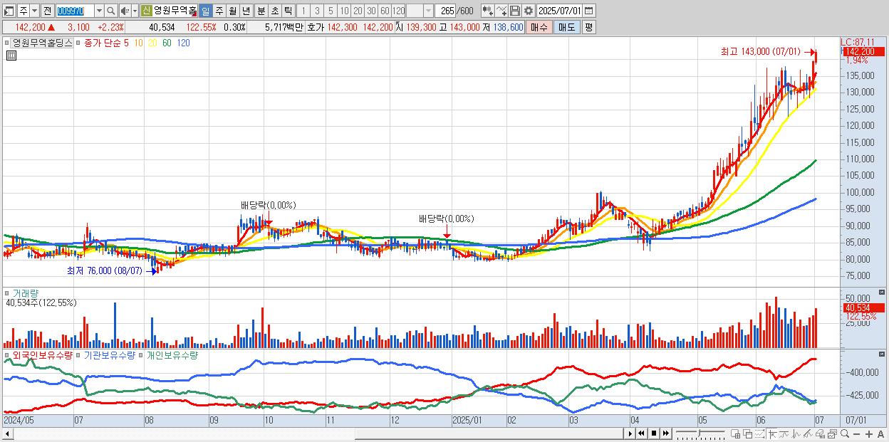 - 영원무역홀딩스 (141,400원 ▲ 1.65% , 시총: 19,088억, 거래량: 37,935, 거래대금:54억, KOSPI)