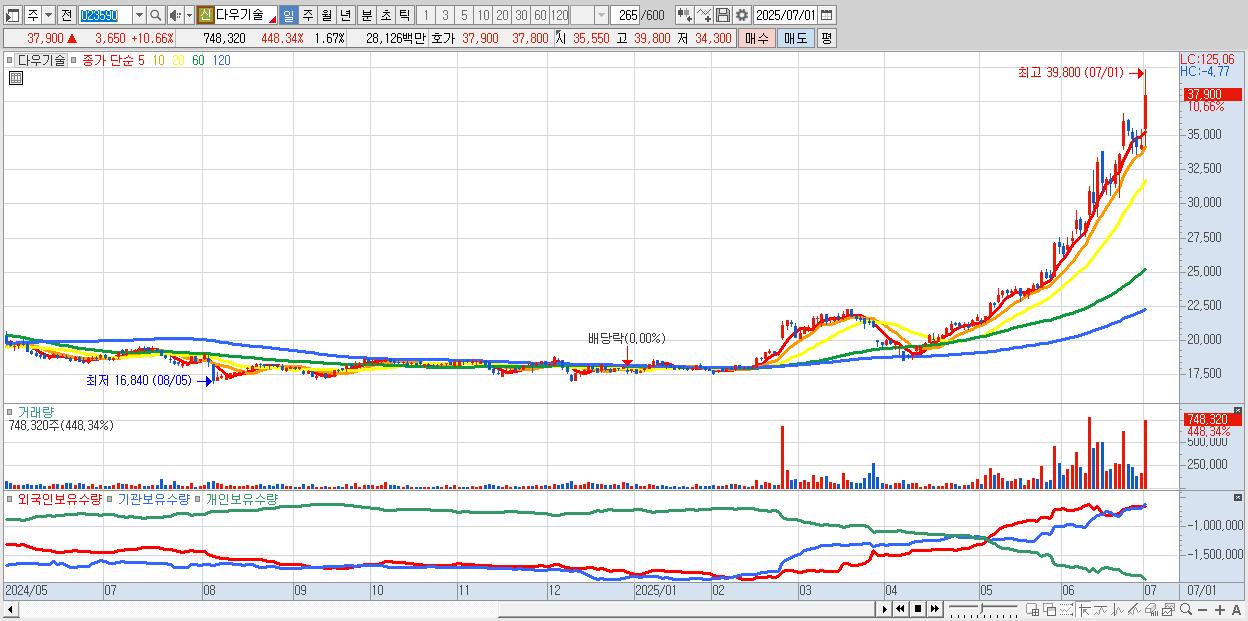 - 다우기술 (37,650원 ▲ 9.93% , 시총: 16,892억, 거래량: 450,064, 거래대금:168억, KOSPI)