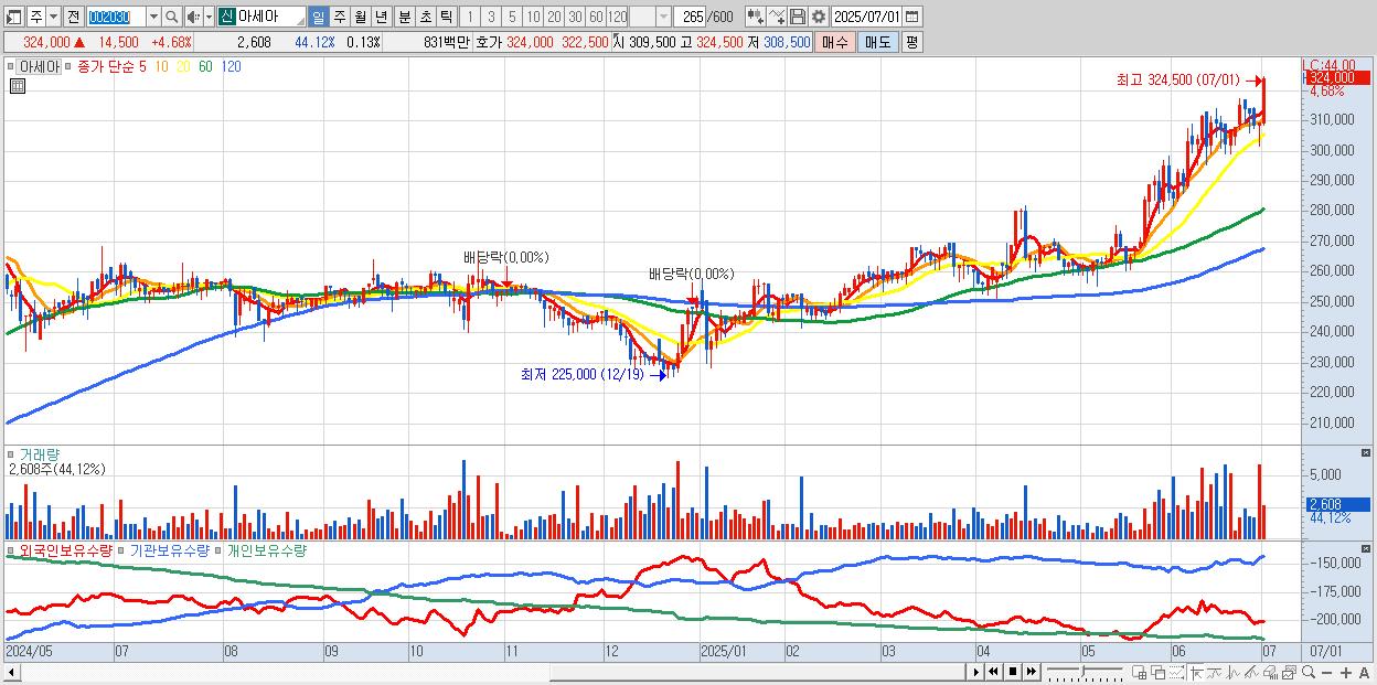 - 아세아 (324,000원 ▲ 4.68% , 시총: 6,753억, 거래량: 2,608, 거래대금:8억, KOSPI)