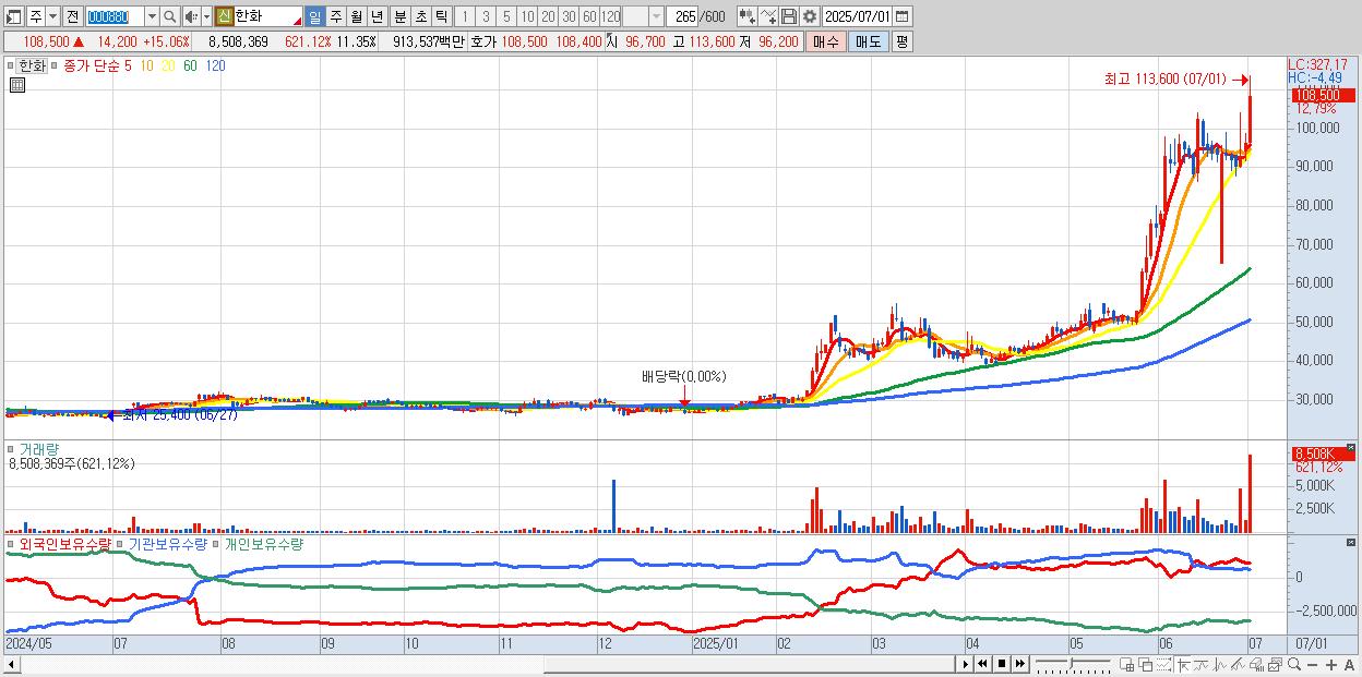- 한화 (108,800원 ▲ 15.38% , 시총: 81,555억, 거래량: 4,355,133, 거래대금:4,705억, KOSPI)