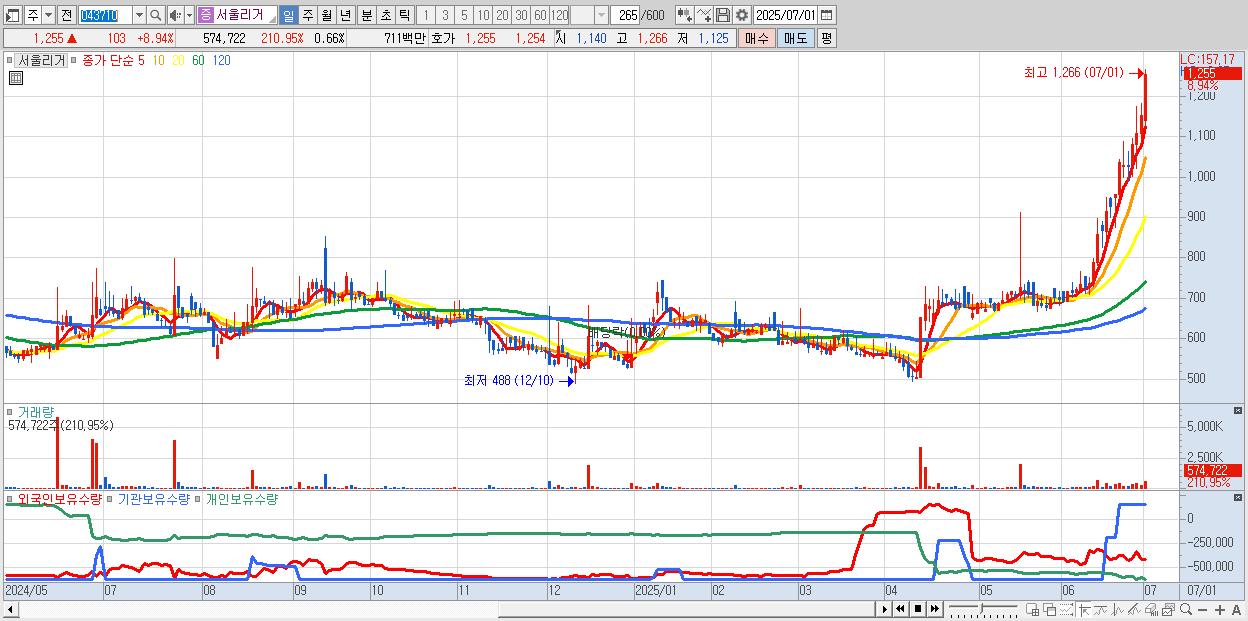 - 서울리거 (1,255원 ▲ 8.94% , 시총: 1,086억, 거래량: 574,722, 거래대금:7억, KOSDAQ)