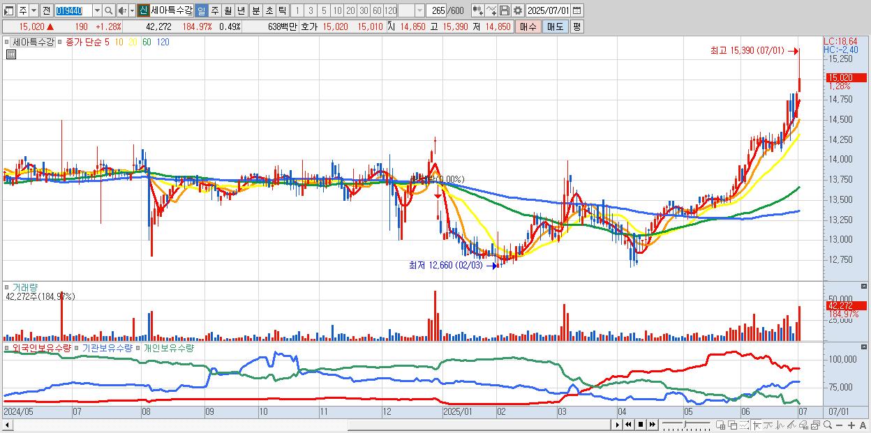 - 세아특수강 (15,020원 ▲ 1.28% , 시총: 1,287억, 거래량: 42,272, 거래대금:6억, KOSPI)