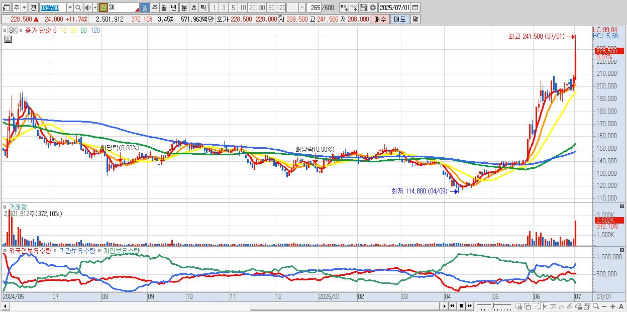 - SK (224,000원 ▲ 9.54% , 시총: 162,406억, 거래량: 1,396,309, 거래대금:3,197억, KOSPI)