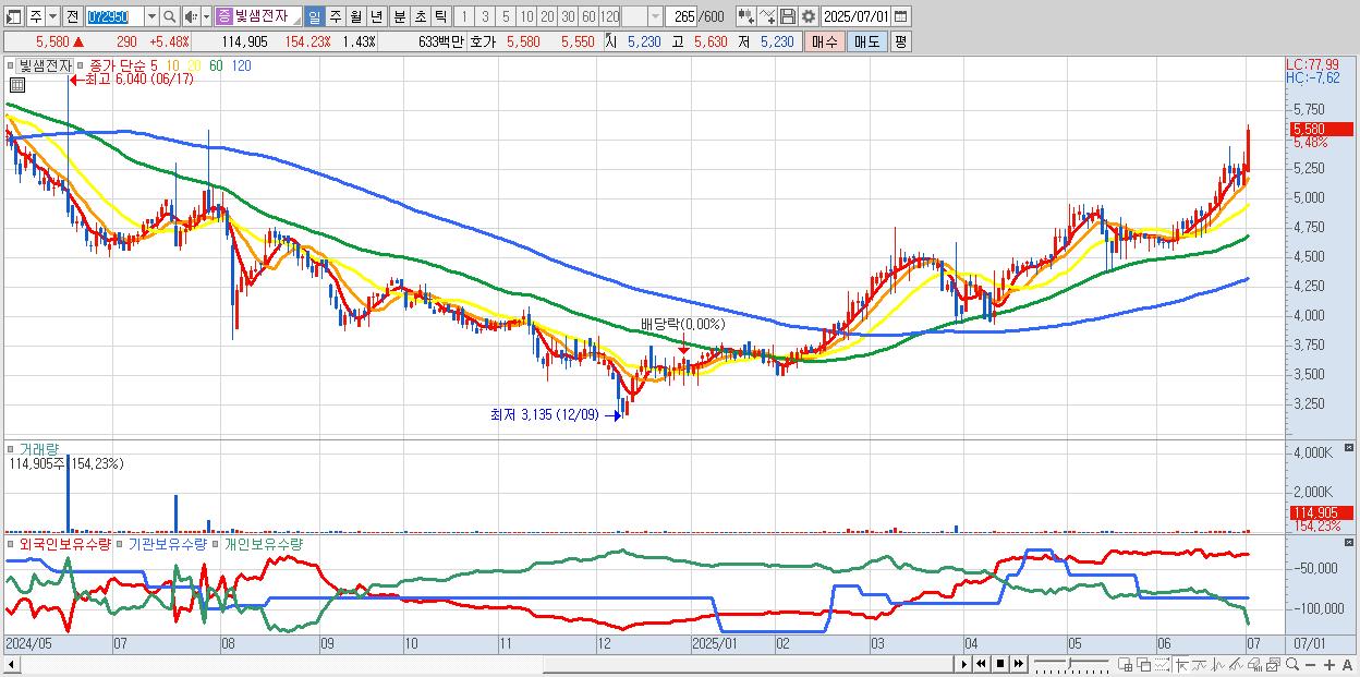 - 빛샘전자 (5,580원 ▲ 5.48% , 시총: 449억, 거래량: 114,905, 거래대금:6억, KOSDAQ)