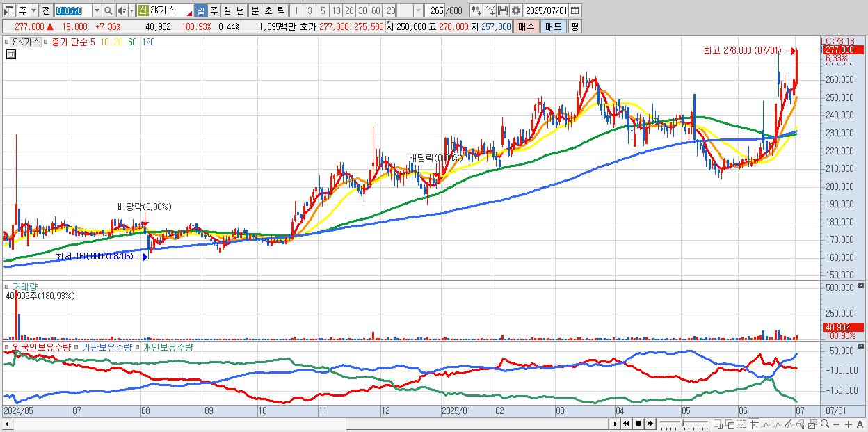 - SK가스 (274,500원 ▲ 6.4% , 시총: 25,378억, 거래량: 31,798, 거래대금:86억, KOSPI)