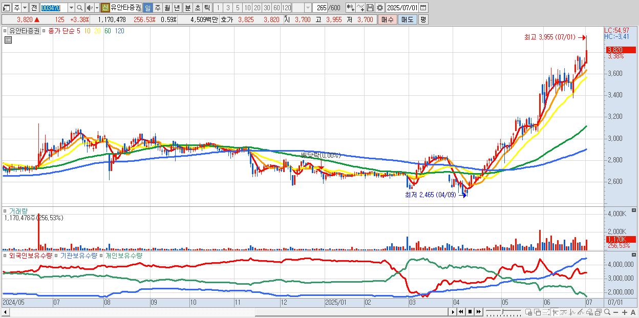 - 유안타증권 (3,820원 ▲ 3.38% , 시총: 7,625억, 거래량: 1,170,478, 거래대금:45억, KOSPI)