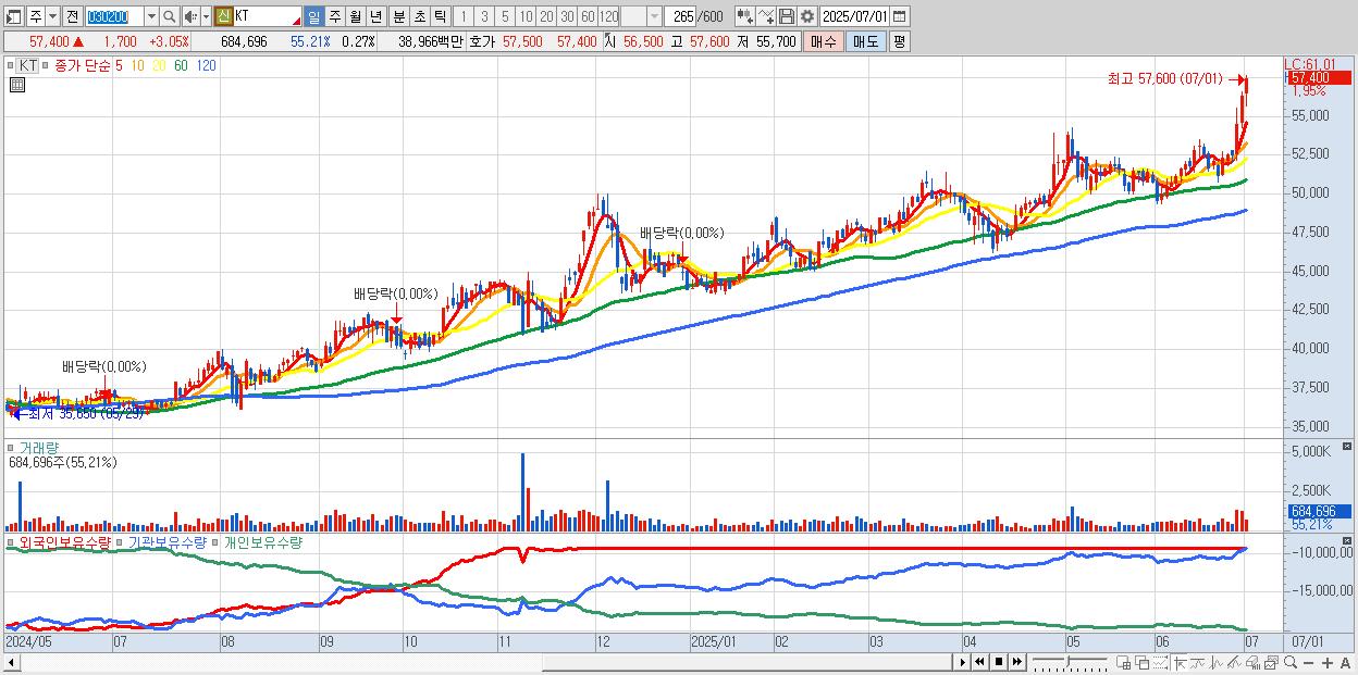 - KT (57,300원 ▲ 2.87% , 시총: 144,408억, 거래량: 543,599, 거래대금:309억, KOSPI)