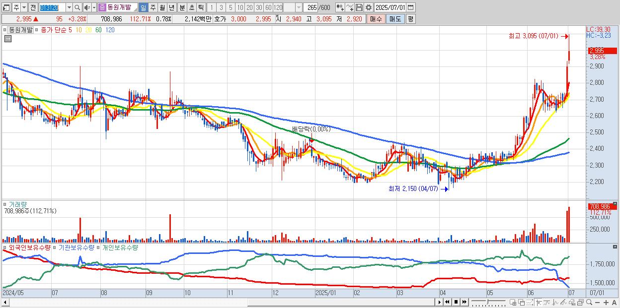 - 동원개발 (2,995원 ▲ 3.28% , 시총: 2,720억, 거래량: 708,986, 거래대금:21억, KOSDAQ)