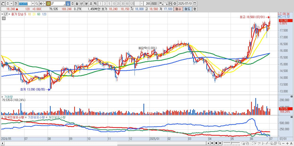- LF (18,240원 ▲ 0.66% , 시총: 5,333억, 거래량: 79,535, 거래대금:15억, KOSPI)