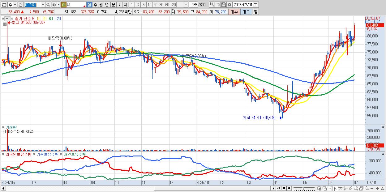 - E1 (83,400원 ▲ 5.7% , 시총: 5,721억, 거래량: 37,861, 거래대금:31억, KOSPI)
