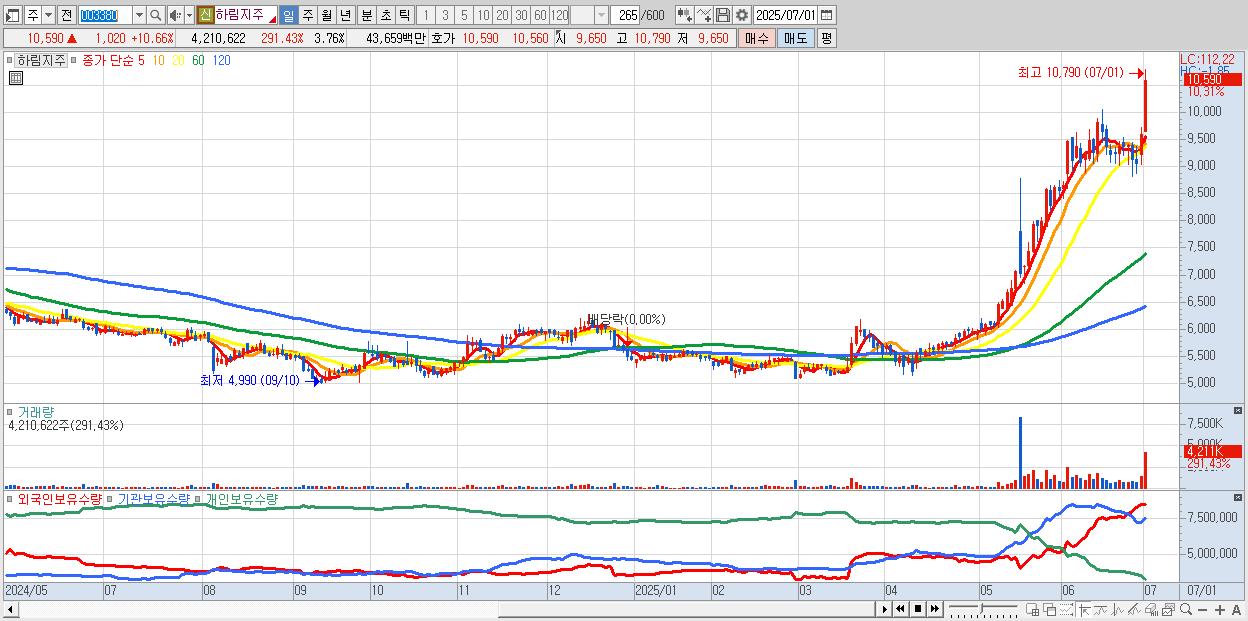 - 하림지주 (10,430원 ▲ 8.99% , 시총: 11,682억, 거래량: 2,338,747, 거래대금:244억, KOSDAQ)