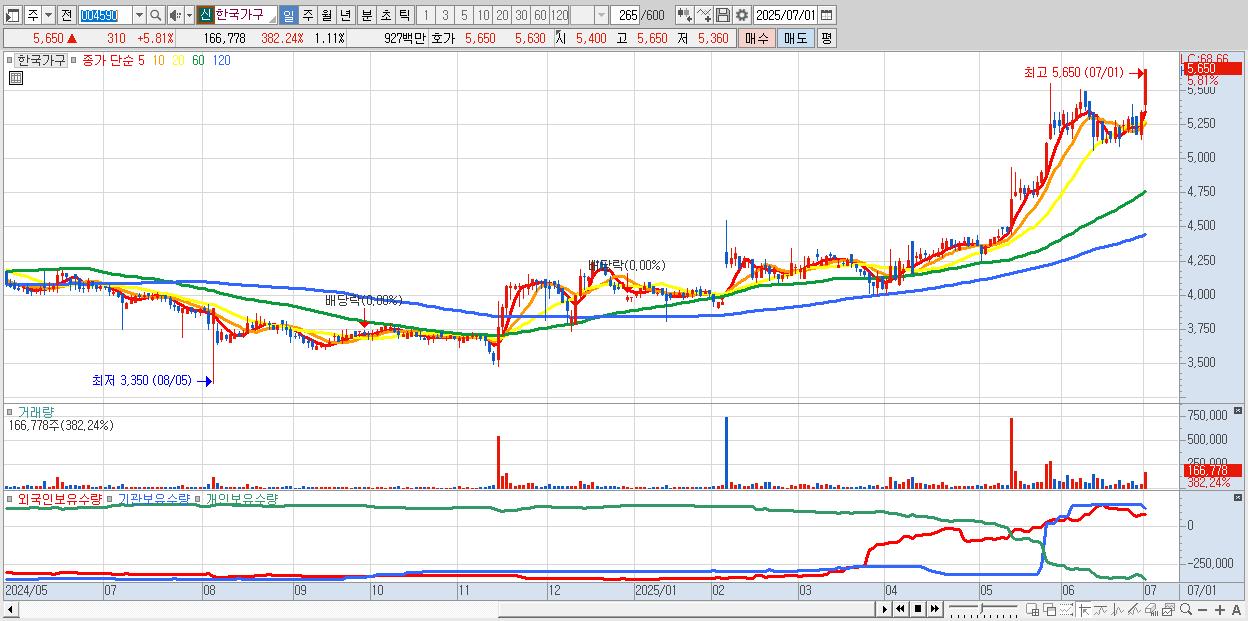 - 한국가구 (5,650원 ▲ 5.81% , 시총: 848억, 거래량: 166,778, 거래대금:9억, KOSDAQ)