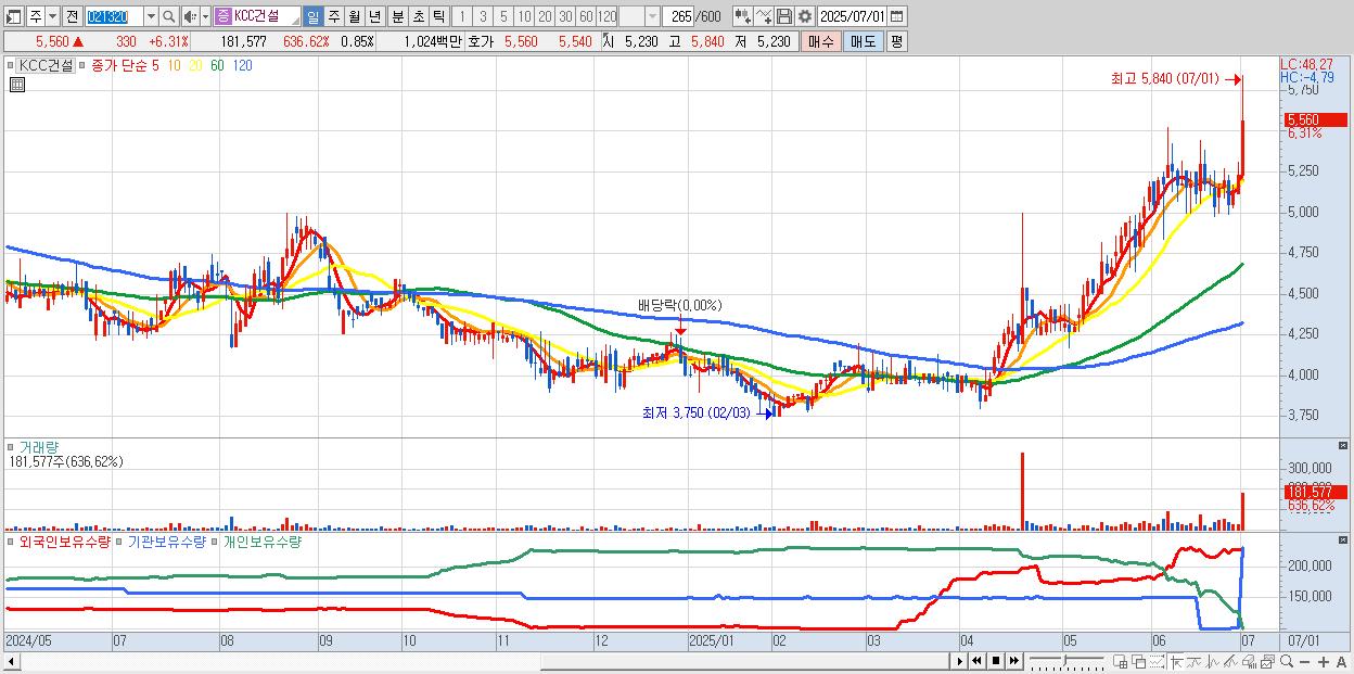 - KCC건설 (5,560원 ▲ 6.31% , 시총: 1,190억, 거래량: 181,577, 거래대금:10억, KOSDAQ)