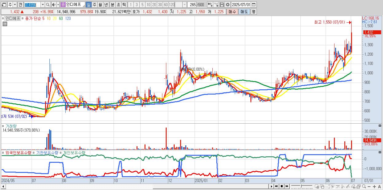 - 인디에프 (1,432원 ▲ 16.99% , 시총: 1,076억, 거래량: 14,948,996, 거래대금:216억, KOSPI)