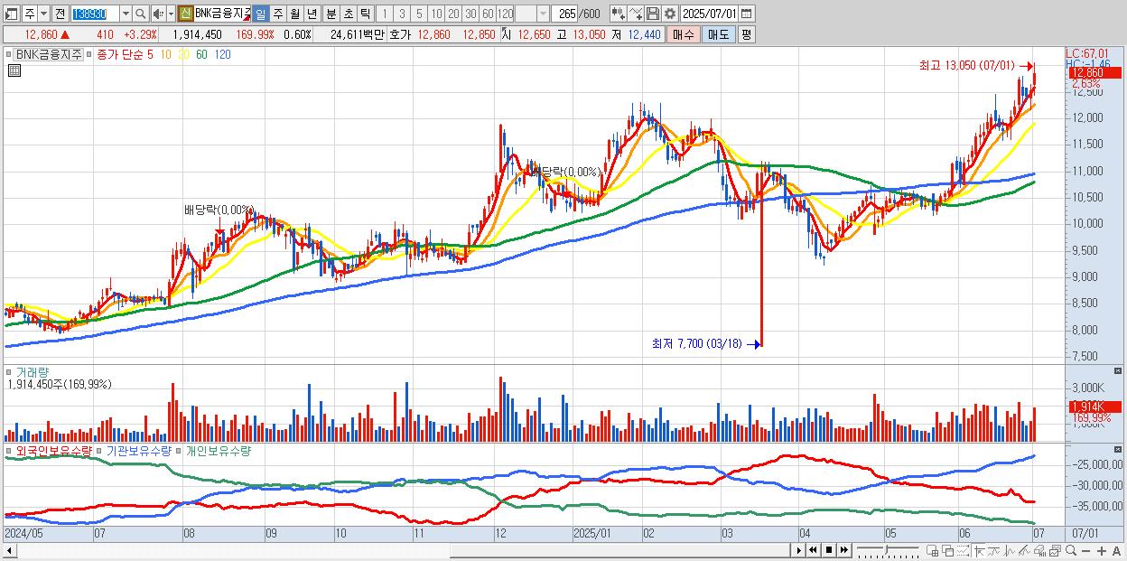 - BNK금융지주 (12,820원 ▲ 2.97% , 시총: 40,817억, 거래량: 1,713,055, 거래대금:220억, KOSPI)